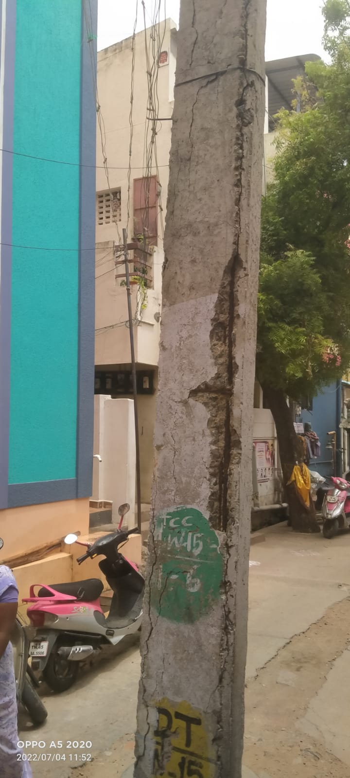 திருச்சி கிழக்குதாராநல்லூர் அக்ரஹாரம் தெருவில் ஏராளமான பொதுமக்கள் வசித்து வருகின்றனர். இப்பகுதியில் உள்ள வீடுகளுக்கு மின் இணைப்பு வழங்கும் வகையில் சாலையோரம் மின்கம்பம் அமைக்கப்பட்டுள்ளது. இந்த மின்கம்பம் அமைக்கப்பட்டு பல ஆண்டுகள் ஆனதால் தற்போது சிதிலமடைந்து எப்போது வேண்டுமானாலும் முறிந்து விழும் நிலையில் உள்ளது. பொதுமக்கள் நடமாட்டத்தின்போது இந்த மின்கம்பம் முறிந்து விழுந்தால் உயிரிழப்பு ஏற்பட அதிக வாய்ப்பு உள்ளது. எனவே இதுகுறித்து சம்பந்தப்பட்ட மின்சாரத்துறை அதிகாரிகள் விரைந்து நடவடிக்கை எடுக்க வேண்டும் என கேட்டுக்கொள்கிறோம்.