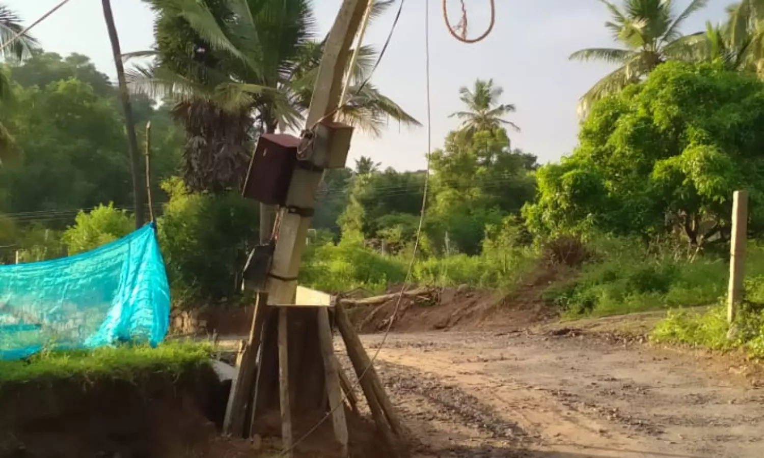 நாமக்கல் மாவட்டம் வெண்ணந்தூர் ஒன்றியம் ஆயிபாளையம் பகுதியில் இருந்து தனியார் பாலிடெக்னிக் கல்லூரி வழியாக முனியப்பன் கோவில் செல்லும் சாலையில் மின்கம்பம் சாய்ந்து சாலையில் விழும் நிலையில் இருந்தது. சாய்ந்து விழாமல் இருக்க அந்த பகுதி மக்கள் மின்கம்பத்தை கயிற்றால் இழுத்து கட்டி வைத்துள்ளனர். இதுகுறித்து அத்தனூர் மின்சார துறைக்கு தகவல் தெரிவித்து ஒரு வாரம் ஆகியும் எவ்வித நடவடிக்கையும் எடுக்கப்படவில்லை. சம்பந்தப்பட்ட அதிகாரிகள் கவனத்தில் கொண்டு ஆபத்தான மின் கம்பத்தை அகற்றி புதிய மின்கம்பம் அமைக்க விரைவில் நடவடிக்கை எடுக்க வேண்டும்.