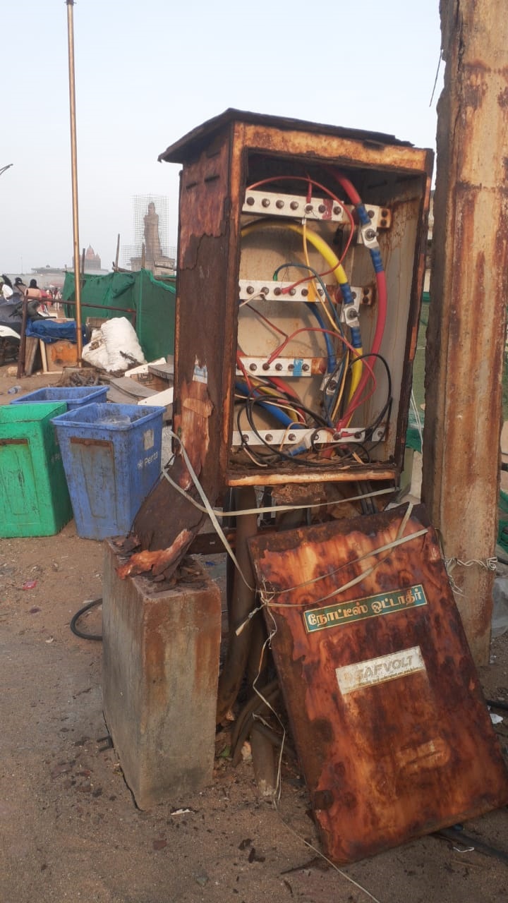 கன்னியாகுமரி காந்தி மண்டபம் அருகில் இருந்து திருவேணி சங்கமம் கடற்கரைக்கு செல்லும் சாலையோரம் மின் இணைப்பு பெட்டி ஒன்று அமைக்கப்பட்டுள்ளது. அப்பகுதியில் உள்ள கடைகளுக்கு மின் இணைப்புக்காக அமைக்கப்பட்டுள்ள இந்த பெட்டி மிகவும் சேதமடைந்து காணப்படுகிறது. எப்போது வேண்டுமானாலும் அந்த பெட்டி சரிந்து விழுந்து அந்த வழியாக செல்வோர் மின்சாரம் பாய்ந்து உயிரிழக்கும் அபாயம் ஏற்பட்டுள்ளது. எனவே, சம்பந்தப்பட்ட அதிகாரிகள் சேதமடைந்த மின்இணைப்பு பெட்டியை அகற்றி விட்டு புதிய பெட்டியை அமைக்க நடவடிக்கை எடுக்க வேண்டும்.