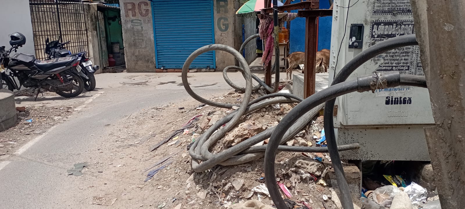 சென்னை வில்லிவாக்கம் ஐ.சி.எப். அனெஸ் தெருவில் டிரான்ஸ்பார்மர் அருகே மின்சார கேபிள்கள் ஆபத்தான முறையில் சாலையில் கிடக்கிறது. இதனால் இந்த சாலையை இரவில் கடந்து செல்லும் மக்கள் அச்சத்துடனே கடந்து செல்கிறார்கள். மின்சார வாரியம் கவனித்து இந்த பிரச்சினையை சரி செய்ய வேண்டும்.