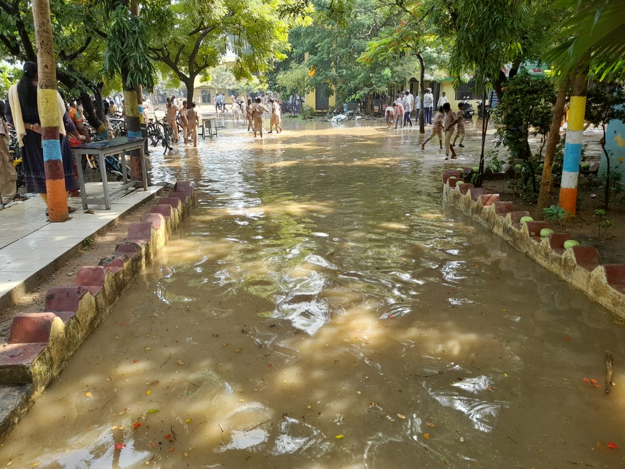 செங்கல்பட்டு மாவட்டம் தாம்பரம் மாநகராட்சிக்குட்பட்ட பீர்க்கன்காரணை அரசு மேல்நிலைப்பள்ளியில் மழைநீர் தேங்கி உள்ளது. இந்த பள்ளியில் படிக்கும் மாணவர்கள் மழைநீரில் நடந்து தான் பள்ளிக்கு வருகின்றனர். மேலும், சற்று முன் பெய்த மழையில் பள்ளி பாட புத்தகங்கள் அனைத்தும் நனைந்து விட்டது. மேலும் பள்ளியின் தரைத்தளமும் மொசமான நிலையில் உள்ளதால் மழைநீர் எளிதில் தேங்கிவிடுகிறது. சம்பந்தபட்ட நிர்வாகம் ஆய்வு செய்து பள்ளியில் தேங்கியிருக்கும் மழைநீரை உடனடியாக அகற்ற வேண்டும்.