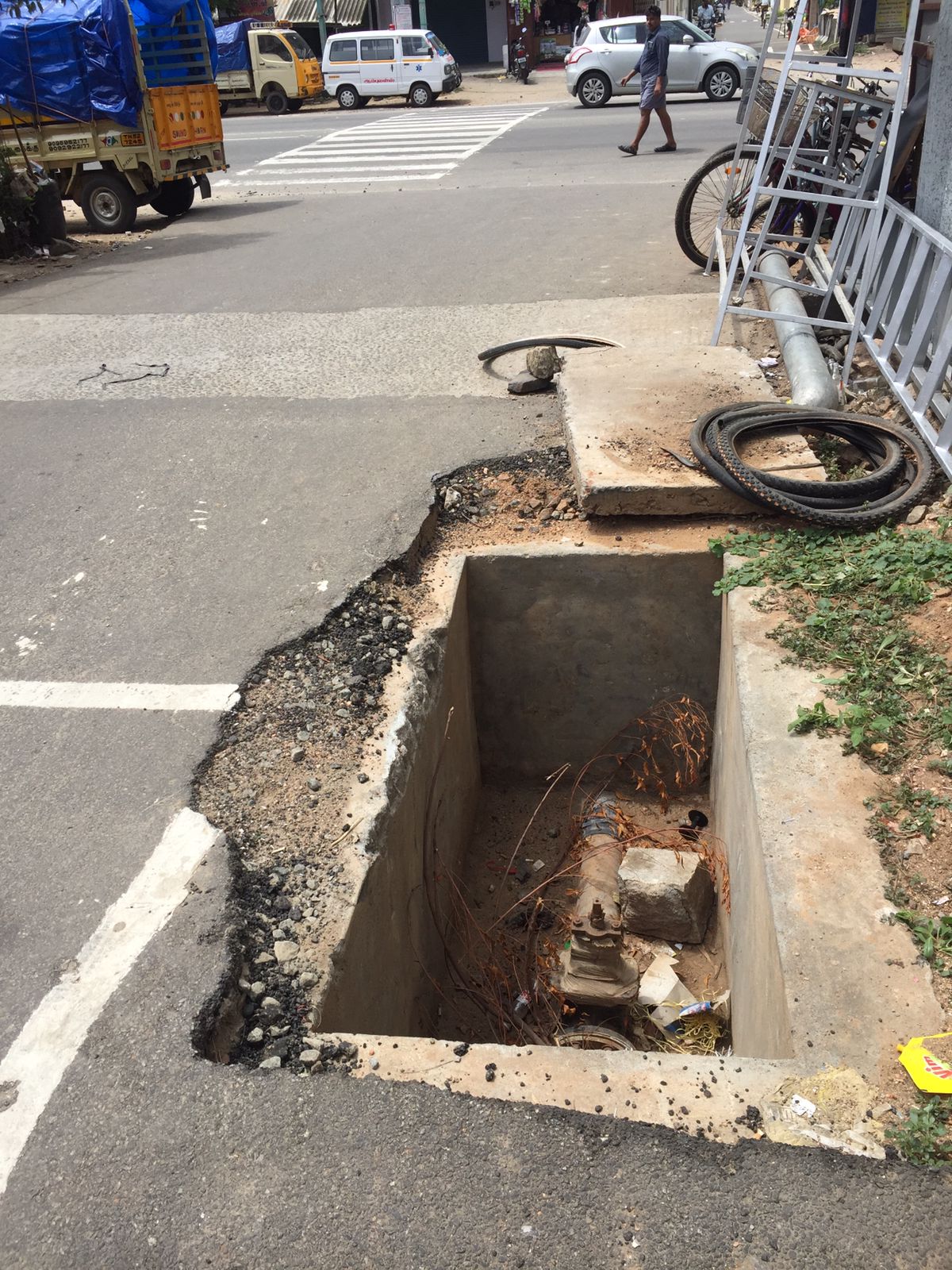 கரூர் வேலுசாமிபுரத்தில் சாலையோரம் குடிநீர் குழாய்கான வால்வு அமைக்கப்பட்டுள்ளது. இந்த வால்வில் அடைப்பு ஏற்பட்டுவிட்டால் அதனை சரிசெய்யும் வகையில் இவற்றை சுற்றி தொட்டி அமைக்கப்பட்டுள்ளது. இந்த தொட்டி சாலையோரத்தில் அமைக்கப்பட்டுள்ளதாலும், சிலாப் கொண்டு மூடப்படாமல் உள்ளதாலும் வாகன ஓட்டிகள் நிலைதடுமாறி இந்த தொட்டியில் வாகனத்தை விட்டு விபத்தில் சிக்கிக்கொள்கின்றனர். மேலும் இரவு நேரத்தில் இந்த தொட்டி இருப்பது தெரியாமல் இருசக்கர வாகனங்களில் செல்பவர்கள் இதில் வாகனத்தை விட்டு நிலை தடுமாறி கீழே விழுந்து காயம் அடைந்து வருகின்றனர். எனவே இதுகுறித்து சம்பந்தப்பட்ட அதிகாரிகள் நடவடிக்கை எடுக்க வேண்டும் என கேட்டுக்கொள்கிறோம்.