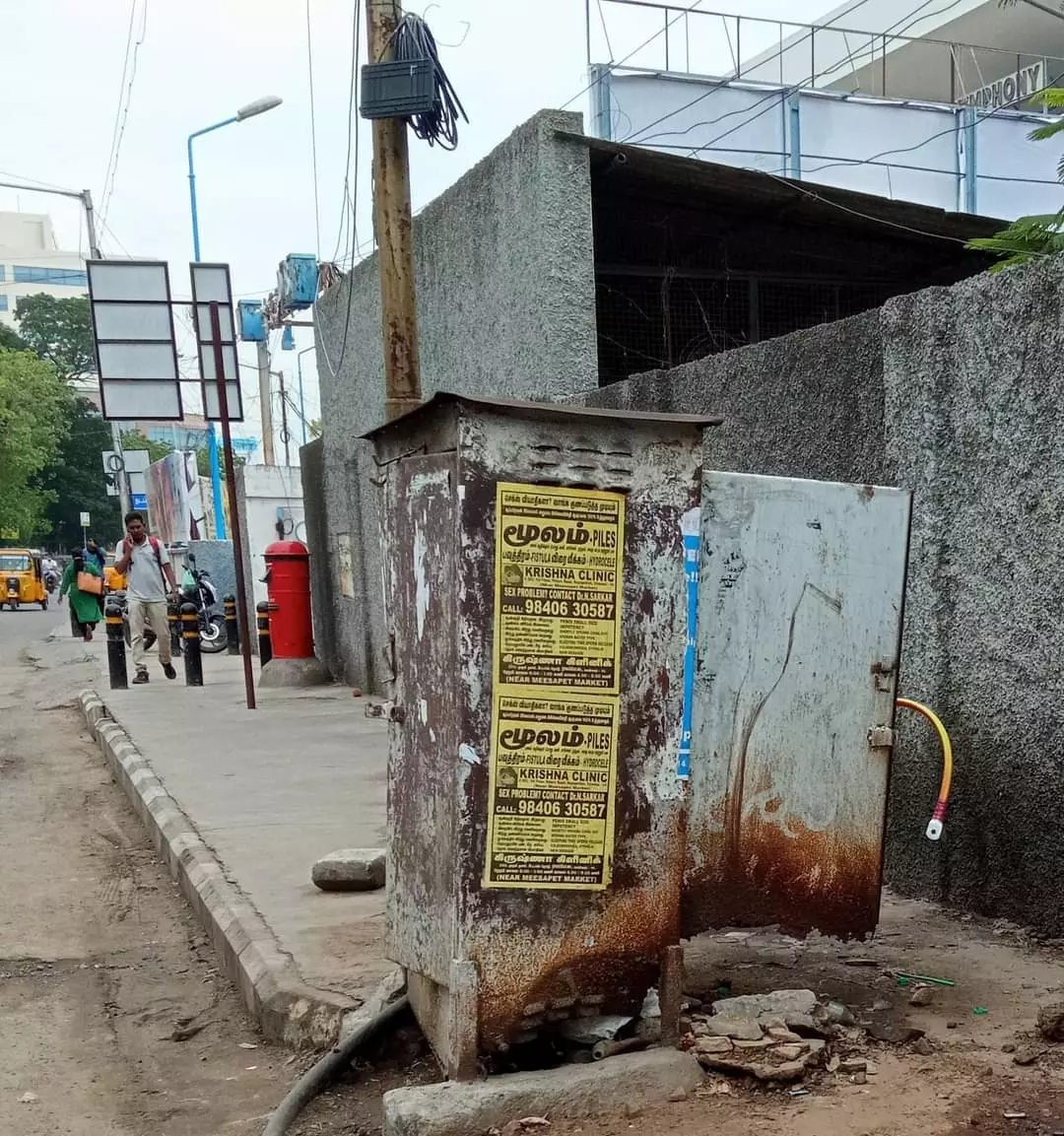 சென்னை ராயப்பேட்டை "வெஸ்ட் 'காட்' சாலையில் உள்ள பிரபல தியேட்டருக்கு அருகில் இருக்கும் நடைபாதையை ஒட்டி அமைக்கப்பட்டுள்ள மின் இணைப்பு பெட்டி திறந்த நிலையிலும், வயர்கள் வெளியே நீட்டிக்கொண்டும் ஆபத்தாக காட்சி தருகிறது. மேலும் அடிக்கடி இந்த மின்சார பெட்டியிலிருந்து தீப்பொறிகளும் வெளியே தெறிக்கின்றன. எனவே பொதுமக்களின் நலன் கருதி திறந்த நிலையில் ஆபத்தாக காட்சி தரும் இந்த மின் இணைப்பு பெட்டியை உடனடியாக சரி செய்ய நடவடிக்கை எடுக்க வேண்டும்.