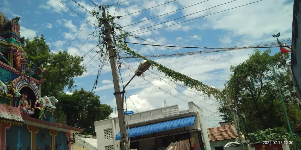 ஈரோடு சென்னிமலை ரோட்டில் விவேகானந்தா நகாில் தொழில் பேட்டை பின்புறம் ஒரு மின்கம்பத்தை செடிகள் ஆக்கிரமித்து விட்டன. மின்வாாிய பணியாளா்கள் உடனே இதை கவனிப்பாா்களா?