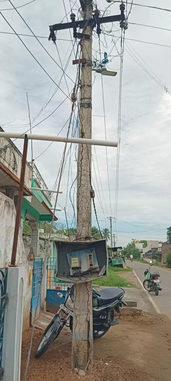 ஆரணி தாலுகா அக்ராபாளையம் கிராமத்தில் மேட்டுத்தெரு பகுதியில் தெருவிளக்குகளுக்கு மின் இணைப்பு கொடுக்கப்படும் பெட்டி உள்ள மின்கம்பம் சேதம் அடைந்துள்ளது. இரும்புக்கம்பிகள் துருப்பிடித்த நிலையில் வெளியே தெரிகின்றன. மழைக் காலங்களில் மின் கசிவு ஏற்பட்டு ஆபத்து நடக்க வாய்ப்புள்ளது. அந்த மின் கம்பத்தை அகற்றி விட்டு புதிய மின்கம்பம் நட்டு, பாதுகாப்பான பெட்டி அமைத்துத் தர சம்பந்தப்பட்ட மின் வாரியத்துறை அதிகாரிகள் நடவடிக்கை எடுப்பார்களா?