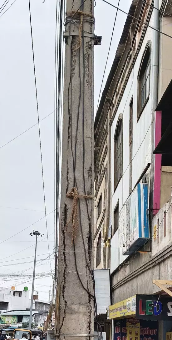 அரக்கோணம் சுவால்பேட்டையில் திருத்தணி சாலையில் மின்கம்பம் ஒன்று சேதம் அடைந்து சிமெண்டு பூச்சுகள் பெயர்ந்து உள்ளே இருக்கும் இரும்புக்கம்பிகள் வெளியே தெரிகின்றன. அந்த மின் கம்பத்தில் உள்ள சுவிட்ச் போர்டு திறந்த நிலையில் உள்ளது. அதில் உள்ள ஒயர்கள் கீழே சாலையில் செல்பவர்களின் கையில் படும்படியாக உள்ளது. இதுகுறித்து மின் வாரிய அதிகாரிகளுக்கு பல முறை புகார் தெரிவித்தும் கண்டு கொள்ளாமல் உள்ளனர். அசம்பாவிதம் நடக்கும் முன் சம்பந்தப்பட்ட மின்வாரியத்துறையினர் நடவடிக்கை எடுப்பார்களா?
