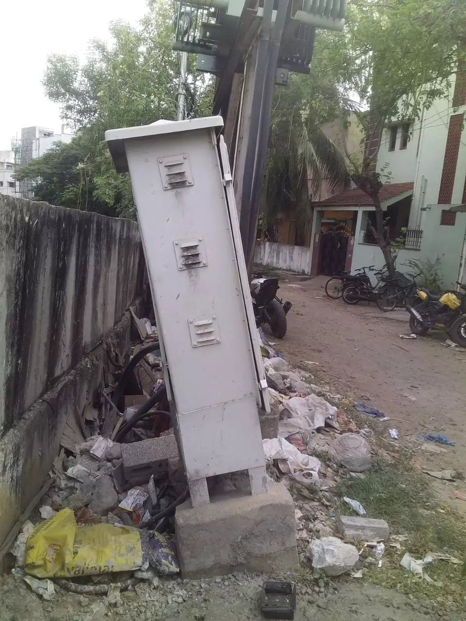 சாய்ந்த நிலையில் மின் இணைப்பு பெட்டி