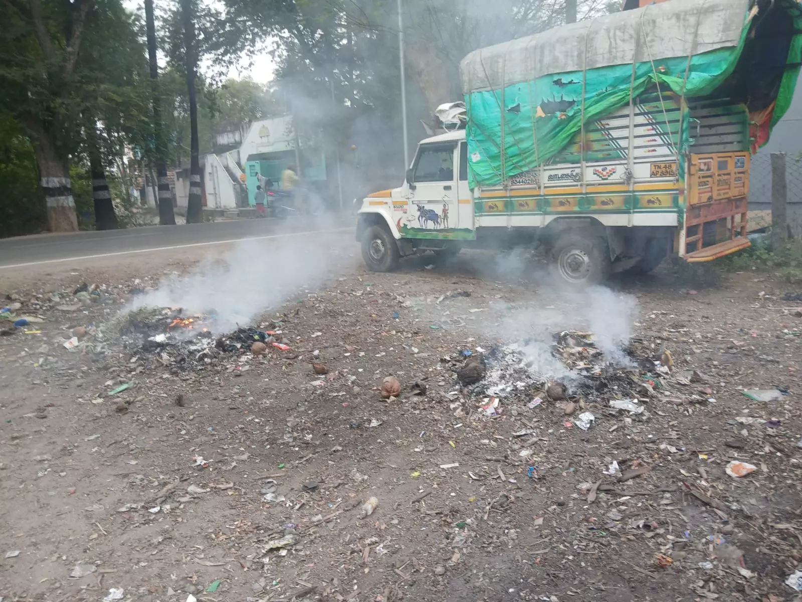 திருச்சி மாவட்டம் லால்குடி தாலுகா மாடக்குடிக்கு உட்பட்ட பள்ளிவிடையை சேர்ந்த ராசையன் கோவில் சமயபுரம், மண்ணச்சநல்லூர் சாலையில் அமைந்துள்ளது. இப்பகுதியில் சேகரமாகும் குப்பைகளை காலிமனையில் கொட்டி, அவ்வப்போது லாரிகளில் ஏற்றிச்செல்வது வழக்கம். இந்நிலையில் தற்போது குப்பைகளை தீ வைத்து எரிக்கின்றனர். அப்போது எழும் புகை மூட்டத்தால், பொதுமக்கள் மூச்சுத்திணறல் ஏற்பட்டு அவதிக்குள்ளாகின்றனர். எனவே குப்பைகளை தீ வைத்து எரிக்காமல், லாரிகளில் அகற்ற சம்பந்தப்பட்ட அதிகாரிகள் நடவடிக்கை எடுக்க வேண்டும் என கேட்டுக்கொள்கிறோம்.