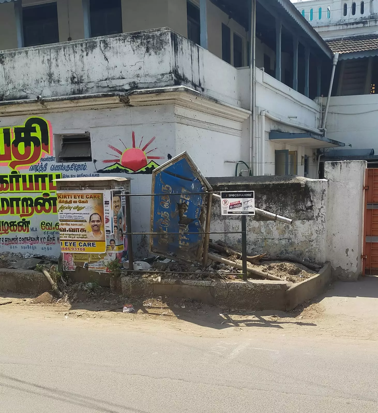 குப்பைகளுடன் இருக்கும் பெயர் பலகை