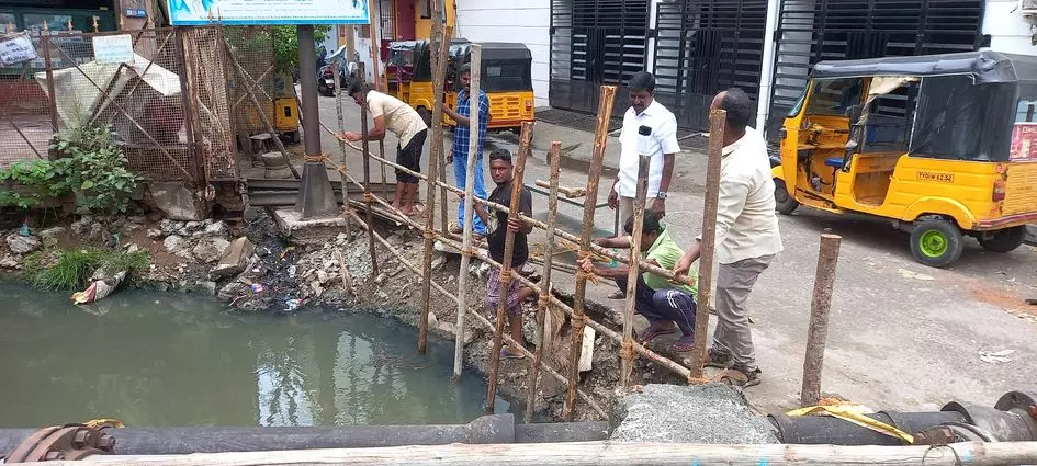 புதுச்சேரி நெல்லித்தோப்பு சுப்பையா சிலை அருகே உள்ள கழிவுநீர் கால்வாயில் பக்கவாட்டு தடுப்புச்சுவர் இல்லாததால் தற்காலிக நடவடிக்கையாக சவுக்கு களிகளால் தடுப்பு அமைக்கப்பட்டுள்ளது. இதற்கு நிரந்தர தீர்வாக தடுப்புச்சுவர் அமைக்கவேண்டும்.