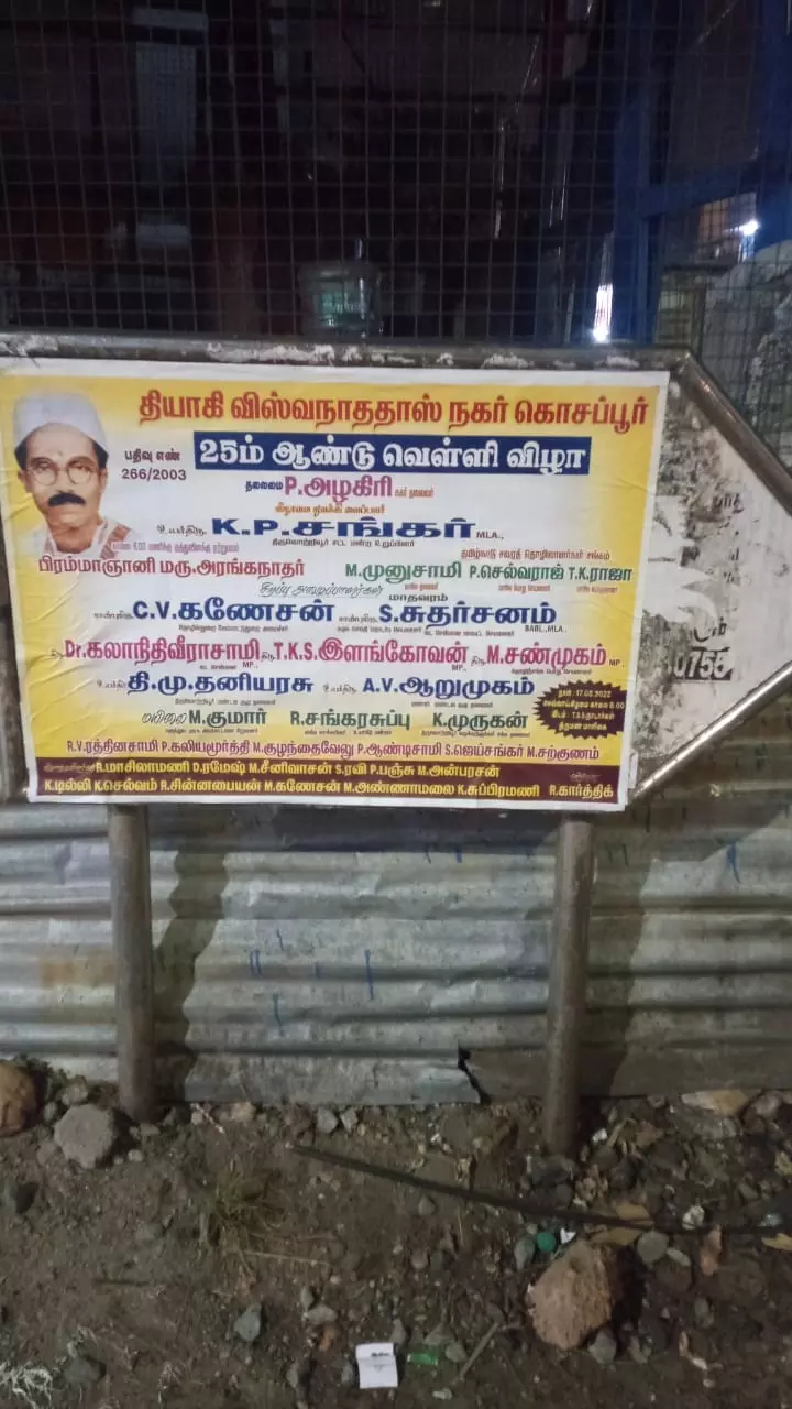 சென்னை திருவொற்றியூர் நெடுஞ்சாலை எல்லையம்மன் கோவில் அருகிலுள்ள பெயர் பலகையில் சுவரொட்டிகள் ஒட்டப்பட்டுள்ளது. மாநகராட்சி சார்பில் பெயர் பலகையில் சுவரொட்டிகள் ஒட்டினால் அபராதம் விதித்து நடவடிக்க எடுக்கப்படும் என தெரிவித்து இருந்தும், இது போன்ற செயல்களில் சிலர் ஈடுபட்டு வருகின்றனர். தெரு பெயர் பலகையே தெரியாதவாறு ஒட்டப்படும் சுவரொட்டிகளை அகற்ற நடவடிக்கை எடுக்க வேண்டும்.