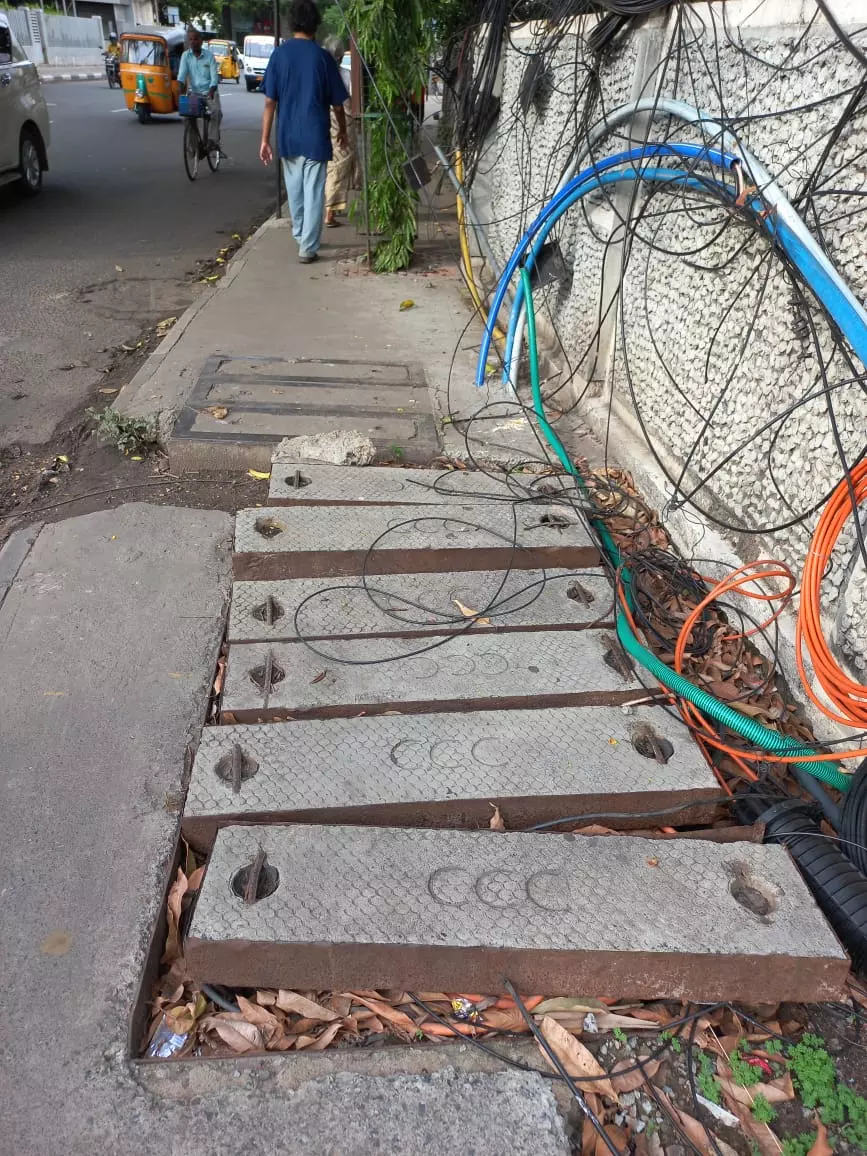 சென்னை நுங்கம்பாக்கம் உத்தமர் காந்தி சாலை மற்றும் ஹேடோஸ் சாலை சந்திப்பு அருகில் உள்ள நடைபாதையில் இணையதள வயர்கள் படர்ந்து கிடக்கின்றன. இதனால் நடைபாதையை பயன்படுத்த முடியாமல் அவதிப்படுகின்றனர். மேலும் நடந்து செல்லும் பாதசாரிகளுக்கு அச்சுறுத்தலாகவும் இருக்கிறது. வயர்களை அப்புறப்படுத்தி அதிகாரிகள் நிரந்தர தீர்வு காண வேண்டும்.