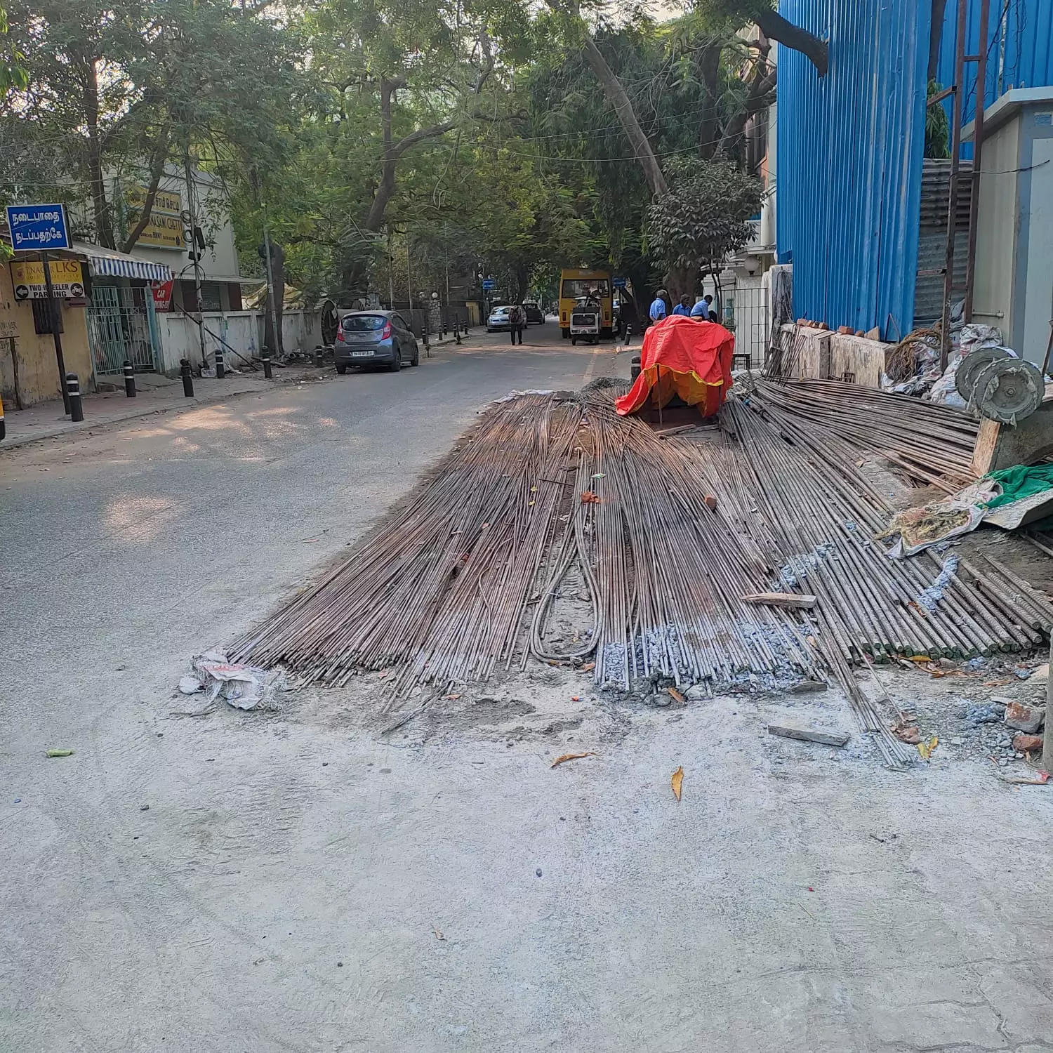 சென்னை தியாகராயர் நகர் பிரபல ஜவுளிக்கடை அருகில் இருக்கும் பிஞ்சாலா சுப்பிரமணியன் தெருவில் கட்டுமானப்பணி நடக்கிறது. ஆனால் கட்டுமானப்பணிக்கு தேவையான கம்பிகள் போன்ற பொருள்கள் சாலையின் பாதி இடத்தை அடைத்துக் கொண்டிருப்பதால், இந்த இடத்தில் பயணம் செய்யவே மக்கள் சிரமப்படுகிறார்கள். மேலும் சாலையின் இரண்டும் பக்கத்திலும் வாகனம் வரும்போது இந்த சாலையில் போக்குவரத்து நெரிசல் ஏற்படுகிறது. சம்பந்தபட்ட அதிகாரிகள் இது குறித்து உடனடி நடவடிக்கையை மேற்கொள்ளவேண்டும்.