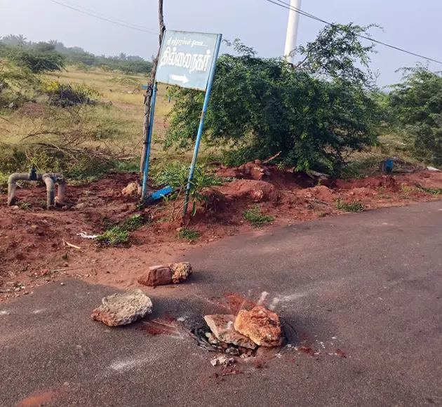 ராதாபுரம் தாலுகா விஜயாபதி பஞ்சாயத்து தில்லை நகர் பஸ் நிறுத்தம் அருகில் சாலை நடுவில் ராட்சத பள்ளம் உள்ளது. இதனால் வாகன விபத்து ஏற்படும் அபாயம் உள்ளதால், ஆபத்தான பள்ளத்தை சீரமைக்க அதிகாரிகள் நடவடிக்கை எடுக்க கேட்டு கொள்கிறேன்.