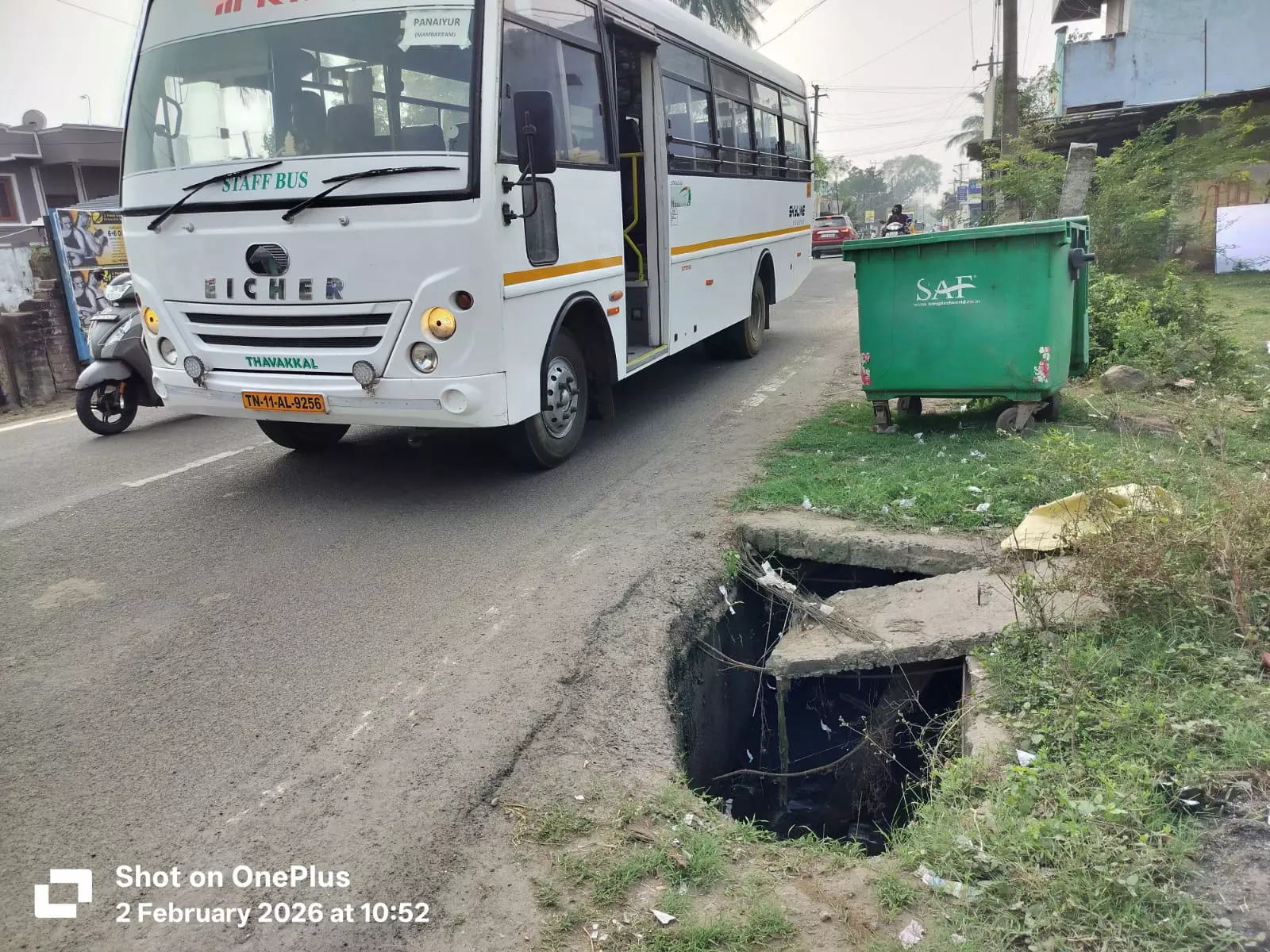 காஞ்சிபுரம் மாவட்டம், குன்றத்தூர் ஊராட்சி ஒன்றியத்துக்கு உட்பட்ட மணிமங்கலம் ஊராட்சியில், தாம்பரம் - ஸ்ரீபெரும்புதூர் சாலை எப்போதும் வாகனங்கள் வந்து செல்லும் பரபரப்பான சாலை. இந்த சாலையில் உள்ள மழைநீர் வடிகால் திறந்த நிலையில் உள்ளது. சாலையில் தடுப்பு இல்லாததால் வாகன ஓட்டிகளும், பொதுமக்களும் அச்சத்துடனே கடந்து செல்கின்றனர். மேலும் கால்நடைகளும் தவறி விழும் அபாய நிலை ஏற்பட்டுள்ளது. எனேவ மாநகராட்சி துறை அதிகாரிகள் உடனடியாக நடவடிக்கை எடுத்து ஆபத்தான நிலையில் உள்ள மழைநீர் கால்வாயை சரிசெய்யவேண்டும்.